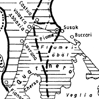 Az 1920 novemberi rapallói szerződésben (174a. térkép) szabad várossá nyilvánított Fiume (megnövelve az egykori osztrák tengerpart 6 km2-es délkeleti csücskével) a "danzigi megoldás" szerint Olaszország határain kívül marad. Jugoszlávia csak Susakot kapja. A szerződést az unió jegyében elutasító d'Annunzio-vezetést olasz csapatok támadása töri meg (1920. dec. 25-i "véres karácsony"). Olaszország 1920. dec. 31-én már új városvezetéssel egyezik meg a rapallói egyezmény, azaz Fiume szabad város státusának elfogadása szellemében (későbbieket ld. 174a1. térkép)
