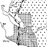 A térképen a háború utáni Albánia a francia hadügyminisztérium 1915-ös etnikai-vallási térképe fölött látható. Kisebbségként (fehér) törökök élnek az Ohridi-tó északi partján (Struga), görögök a Butrinti-tótól keletre Sarandë magasságában, szerbek az északi (Pec), macedoszlávok a keleti határ (Debar-Preszpa) külső oldalán és Korcë körzetében, kutzovlachok Korcë mellett.