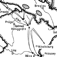 A német kérdés porosz megoldása érdekében Bismarck és III. Napóleon 1865 októberében Biarritzban megállapodik Franciaország semlegességéről egy várható porosz-osztrák háború esetére, majd 1866. ápr. 8-án porosz-olasz szövetség születik az Ausztria elleni közös fellépésről. A német (porosz-osztrák) háború porosz hadüzenettel indul 1866. jún. 14-én. A Habsburgok által mozgósított Német Szövetség Poroszország kilépésével összeomlik. A háborúba szövetségi szerződése értelmében porosz oldalon bekapcsolódik Olaszország. Az osztrák csapatok az olasz fronton ugyan győznek, a poroszoktól azonban július 3-án Königgrätz mellett megsemmisítő vereséget szenvednek. A prágai porosz (augusztus 23.) és a bécsi olasz békében (október 3.) Ausztria Velencétől eltekintve területet ugyan nem veszít, viszont "önként" ki kell vonulnia a Német Szövetségből - bár csatlakozása Németországhoz (anschluss) sokáig nem kerül le végleg napirendről (129a, 197. térkép).